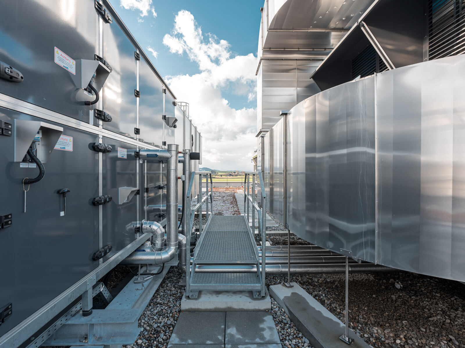 Les travaux suivants ont constitué des défis particuliers: montage résistant au vent et aux intempéries de la centrale de ventilation sur le toit, centrale de chauffage et de froid avec un haut degré de préfabrication.