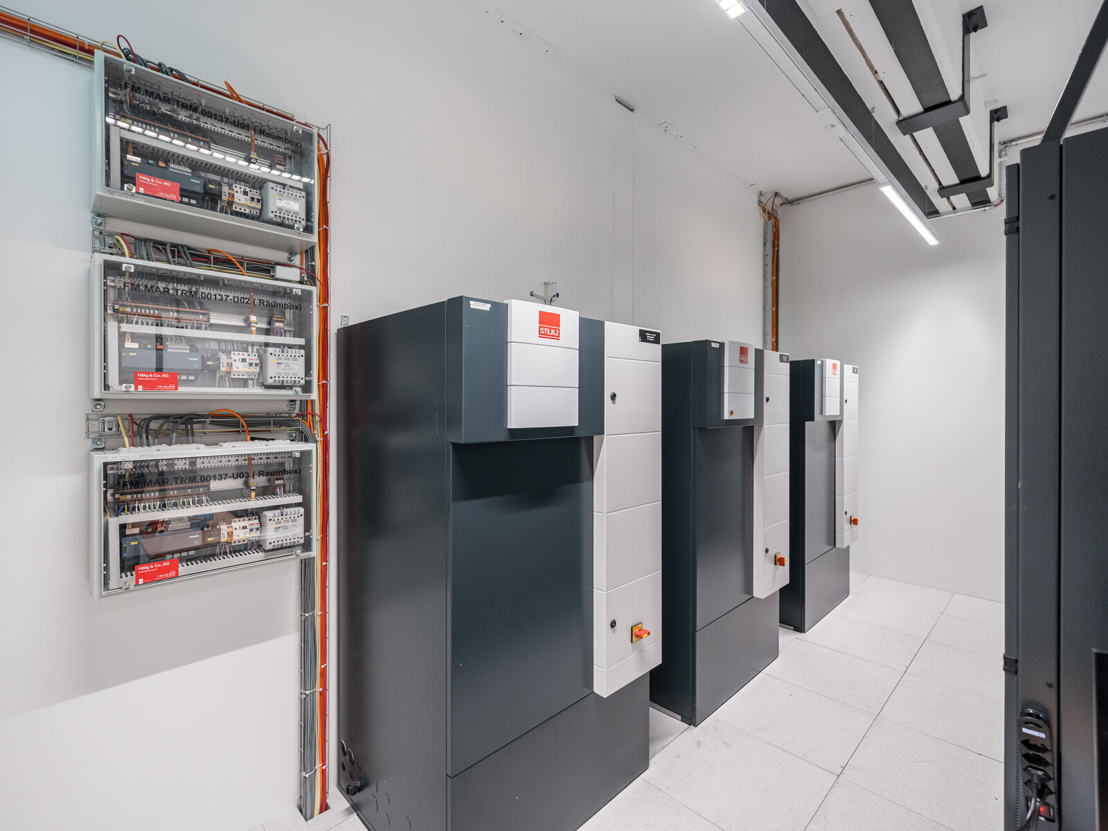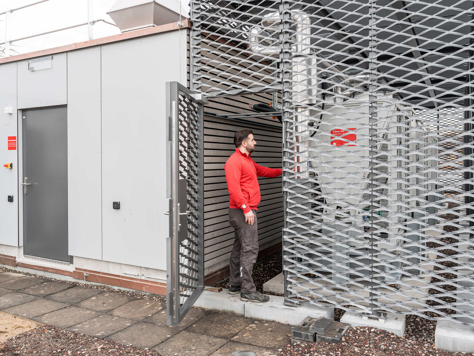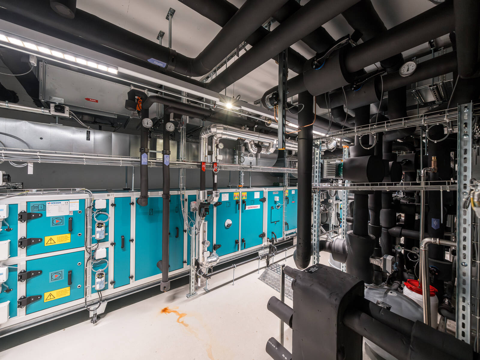 Klima SA Bâle était responsable des équipements de chauffage et de froid. L’ordre englobait notamment la livraison et le montage d’une machine frigorifique avec des refroidisseurs en circuit fermé, des accumulateurs et un système de maintien de la pression pour le chauffage et le froid. Il prévoyait aussi la pose de la tuyauterie, la mise en place d’armoires climatiques pour le refroidissement des serveurs, d’un aérotherme et le raccordement des monoblocs.