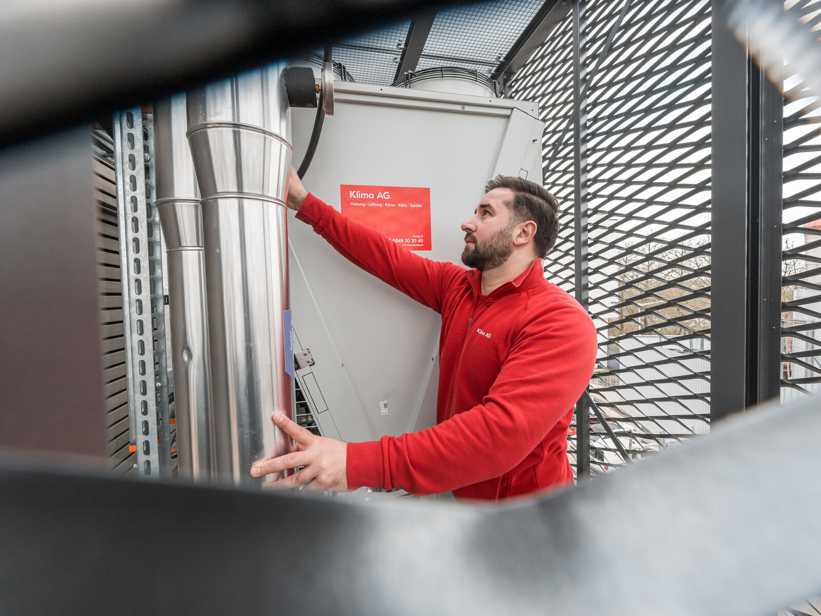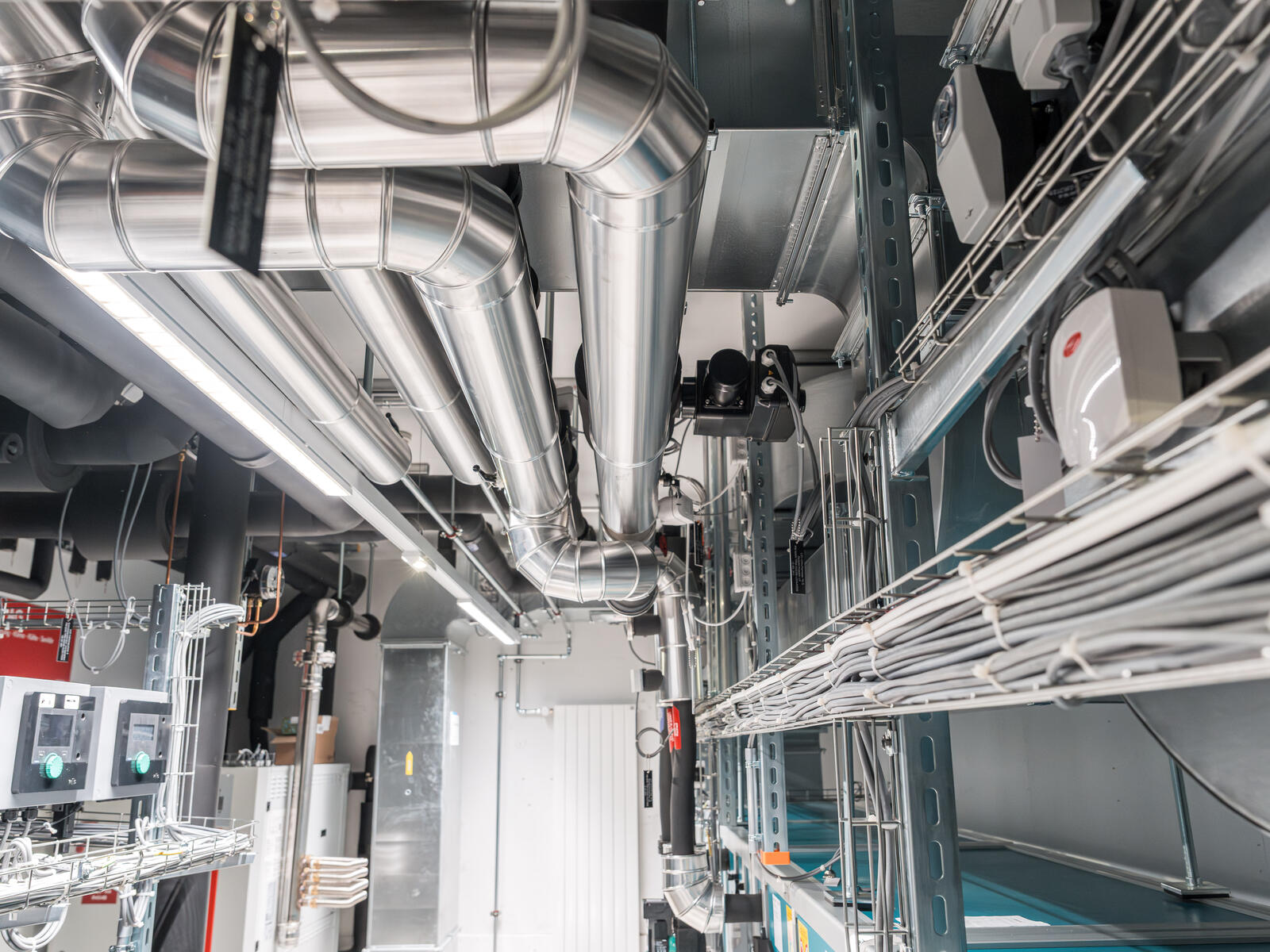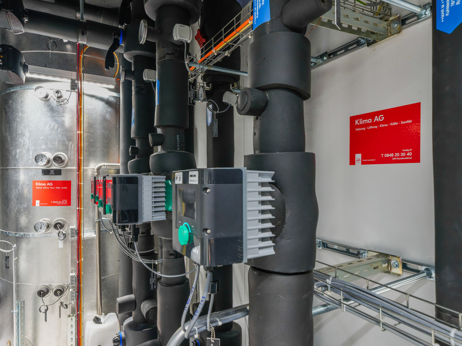 Klima SA Bâle était responsable des équipements de chauffage et de froid. L’ordre englobait notamment la livraison et le montage d’une machine frigorifique avec des refroidisseurs en circuit fermé, des accumulateurs et un système de maintien de la pression pour le chauffage et le froid. Il prévoyait aussi la pose de la tuyauterie, la mise en place d’armoires climatiques pour le refroidissement des serveurs, d’un aérotherme et le raccordement des monoblocs.